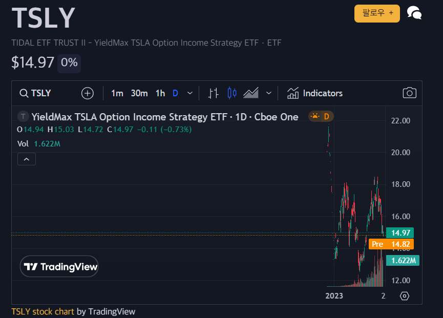 TSLY 주가부터 보시죠. 대략 20달러까지 갔던 주가가 현재는 14불 후반을 기록하면서