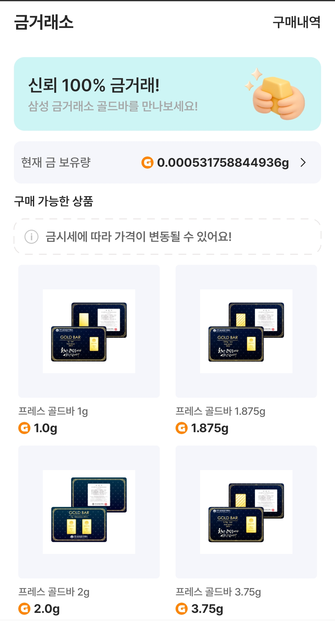 실제로 1g을 모으면 바로 프레스 골드바 1g을 구매할 수 있습니다.
