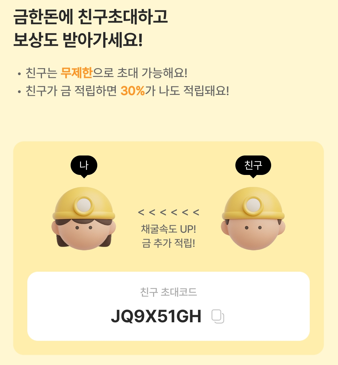 친구초대를 하게되면 친구가 채굴하는 금의 30%를 제공받게 됩니다.