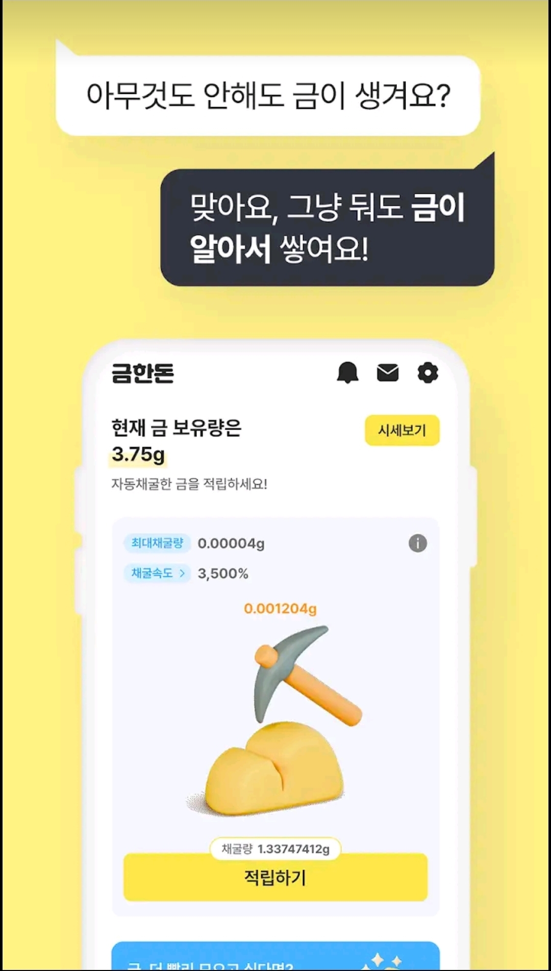 앱을 설치만 해도 진짜 금이 쌓인다! 자동 적립 금한돈, 국내 금 시세 연동으로 더 투명하고 믿을 수 있는 금 앱테크 지금 바로 시작하세요.