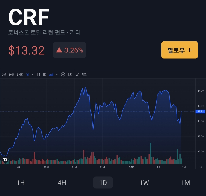 | [4월 15일] CRF(Cornerstone Total Return Fund) 9주 매수 일지 (9) | 2022.04.15 |